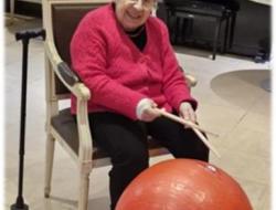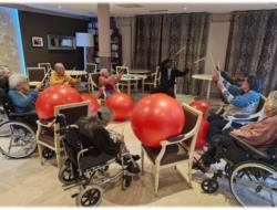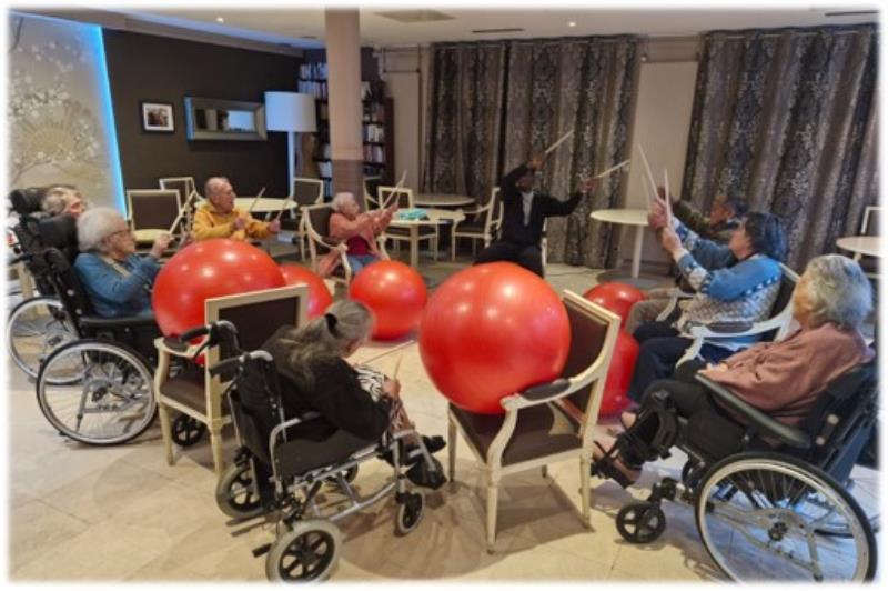 Gros ballons, baguettes de batterie, musique entraînante… et c’est parti pour faire bouger le corps sur un rythme adapté à chacun.