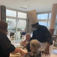 Publiée le 10/10/2021Ce dimanche midi pour notre plus grand plaisir, notre chef de cuisine Paul est allé à la rencontre des résidents et de leur famille. Échanges sympathiques avec Paul les résidents et notre gouvernante Aurélie. Lire la suite