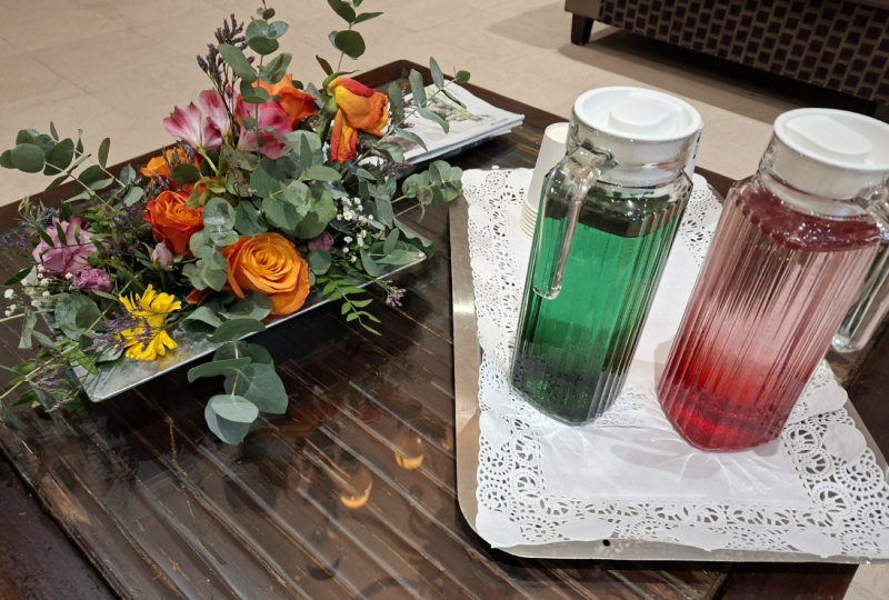 Des boissons rafraichissantes laissées à disposition, des fleurs fraîches, la presse du jour...